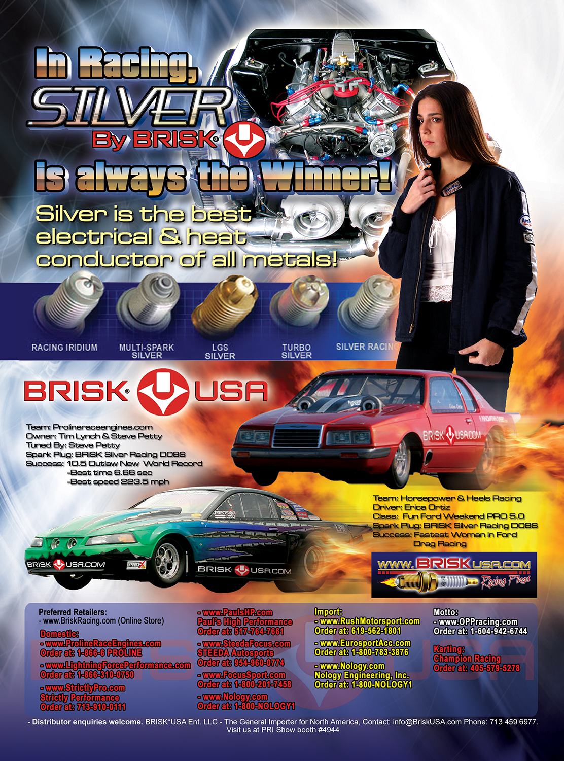 Turned out one of our sales representatives was also a drag racecar driver. One of her sponsors, Brisk USA (a sparkplug manufacturing company) wanted to have a layout created featuring their cars and Erica as their driver.